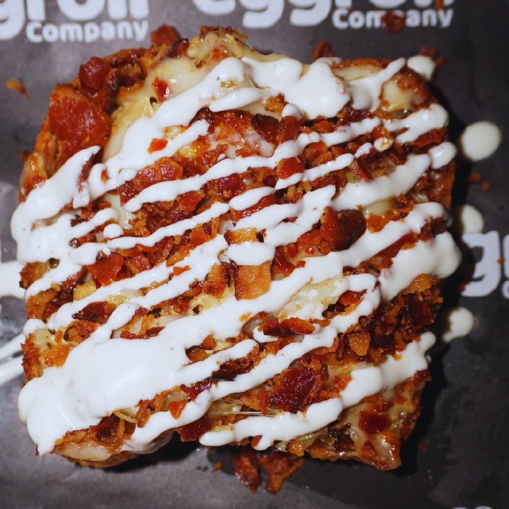 Grilled chicken and crispy bacon meet red onions and sweet-heat peppers, wrapped in melted mozzarella and provolone. Finished with our garlic cheese spread and drizzled with cool, creamy ranch after slicing for the perfect balance of heat and comfort.